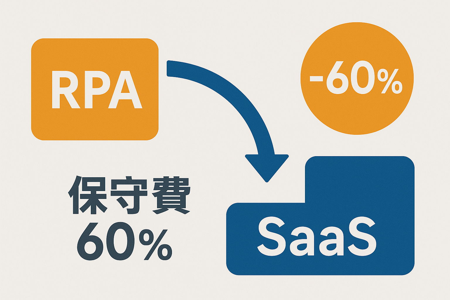 メンテ負荷が膨らんだ RPA を SaaS + Power Apps へ置換。運用コスト 60% 減、変更リードタイム 1/3。ノーコード内製化も支援。
